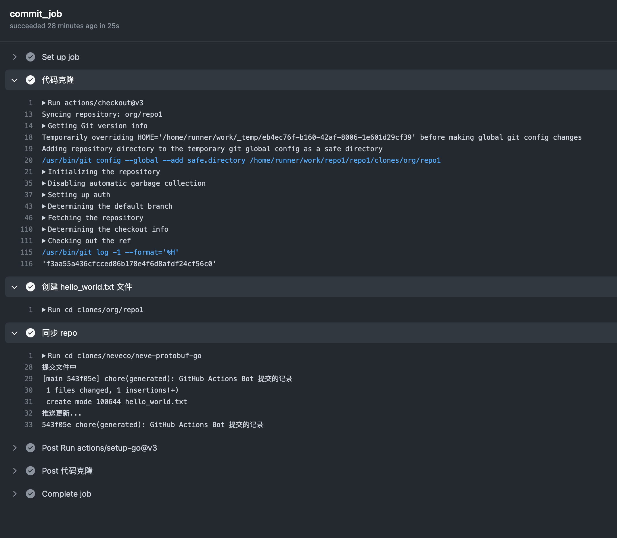 我们在第三部执行中先切换到 clones/org/repo1 目录,然后通过 bash -c '<脚本>' 命令来执行一段多行且带有逻辑判断的脚本。git status --porcelain | wc -l 用于统计当前工作区下的文件变更数量,如果我们不需要提交的时候就跳过提交了。反之我们需要将自己的用户配置为用户名为 github-actions[bot] 和邮箱为 github-actions[bot]@users.noreply.github.com 的用户,然后创建我们的提交 chore(generated): GitHub Actions Bot 提交的记录,最后通过 git push 推送到远程分支上。